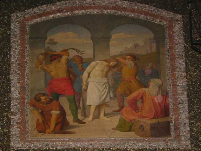 entkleidet an eine Säule gefesselt, wird auf das Grausamste gegeißelt. |