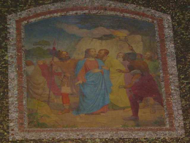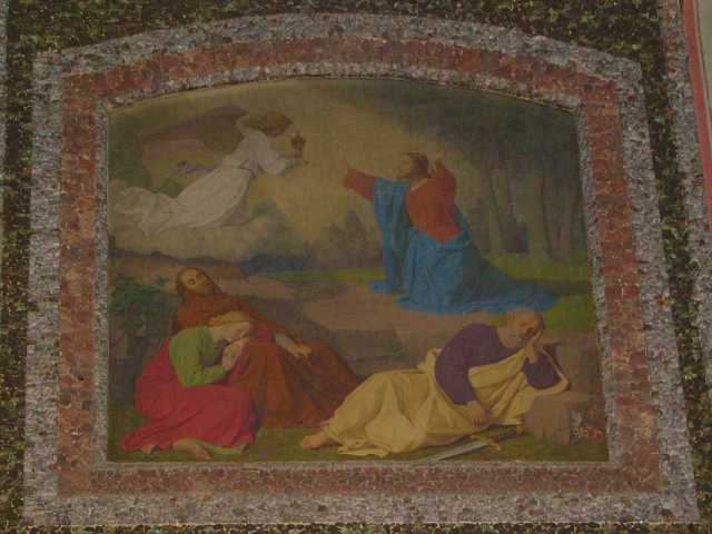 Hier ist der betende und blutschwitzende Heiland am Ölberg dargestellt, derweil die Jünger schlafen, ein Engel bringt den Leidenskelch. Gestiftet von: