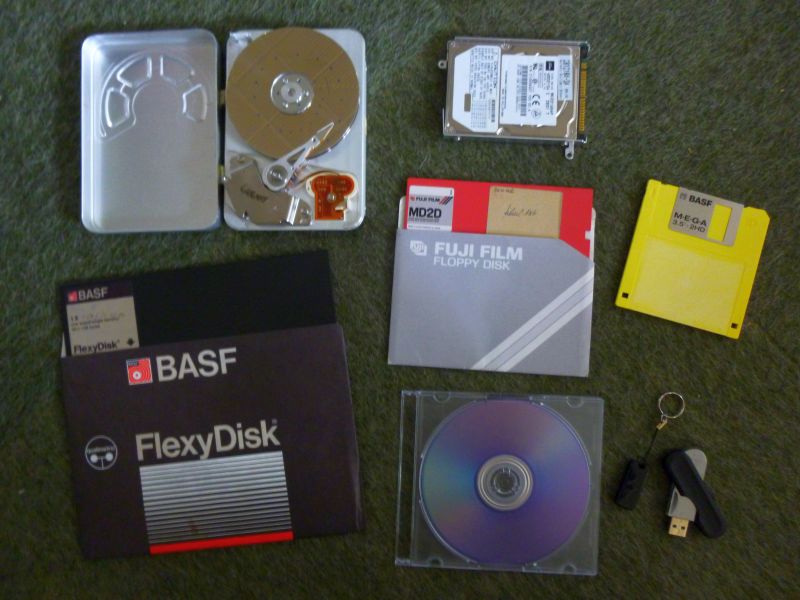 Abgebildet sind Computer-Speichermedien ab etwa 1970, und zwar: - Festplatte, klein: 2“, Speicherkapazität: ca.