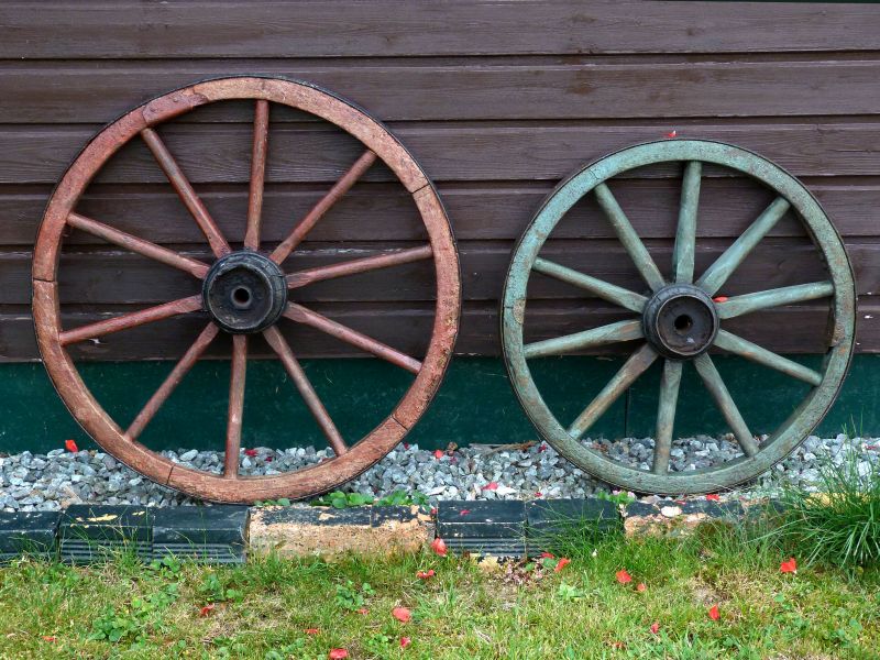 Wagenräder aus Holz leisteten über Jahrtausende gute Dienste sowohl in der Landwirtschaft als auch im Fuhrgewerbe. Sie sorgten zwar für eine für uns heute kaum vorstellbar holprige Fahrt über Stock und Stein oder über gepflasterte Straßen, hatten aber den Vorteil, dass sie innerhalb einer Dorfgemeinschaft leicht hergestellt werden konnten. Der heute fast ausgestorbene Beruf des Stellmachers (Wagners) fand durch Reparaturarbeiten und Neuproduktion sein Auskommen. In der Landwirtschaft waren es vor allem die großen Leiterwagen, die noch bis in die erste Hälfte des 20. Jh. mit hölzernen Rädern ausgestattet wurden. Dann wurden sie abgelöst durch die wesentlich ruhiger laufende Gummibereifung.