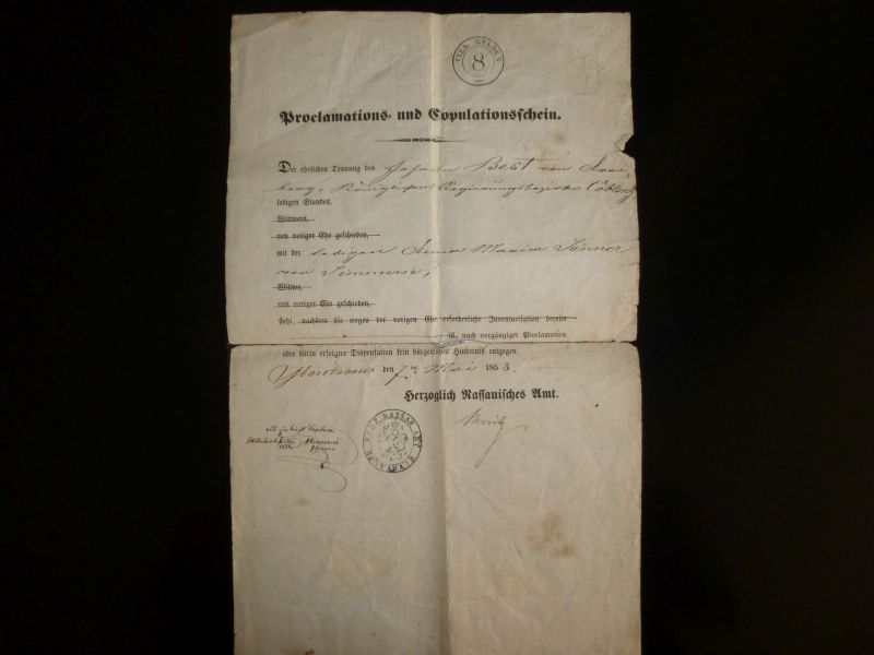 amtliche Genehmigung zur Heirat, hier im Herzogtum Nassau. Wortlaut: "Der ehelichen Trauung des Johannes Best von Arenberg, Königlicher