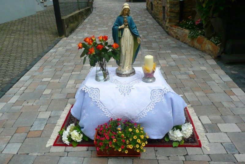 oder –figuren als kleine Hausaltäre in Fensternischen oder auf Treppenstufen aufgebaut