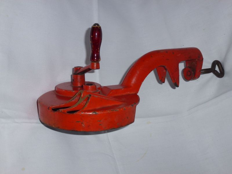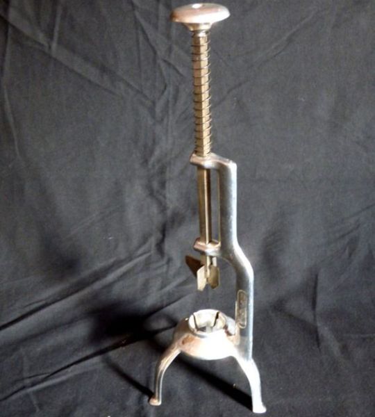 kleines Schneidgerät, das am Küchentisch festgeschraubt wurde. In die beiden Öffnungen