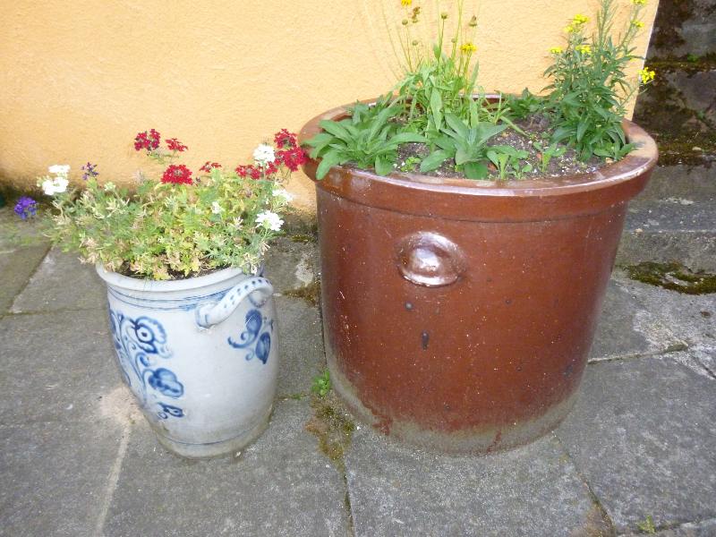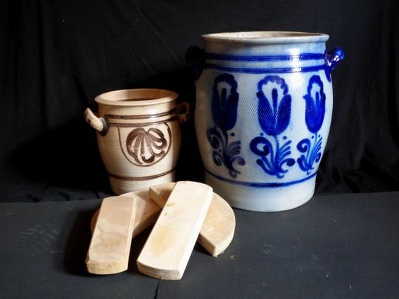 anschließend mit Salz vermischt in solche Steinguttöpfe geschichtet und festgestampft,