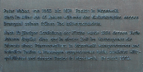 Sein Neffe Johann Baptist Klee aus Arenberg betreute die Gemeinde zunächst als Hilfsgeistlicher mit dem Notwendigsten (Beerdigungen, Taufen, Trauungen die z.T. heimlich stattfinden mussten). Er wurde 1884 Pfarrer in Moselweiß.