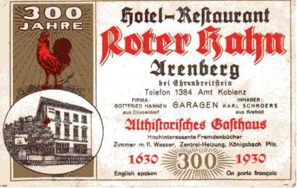 Kaum eins ist aber im deutschen Lande und darüber hinaus so volkstümlich bekannt wie der "Rote Hahn" in Arenberg, der heute auf 300 Jahre seines Bestehens zurückblicken kann, wenigstens seiner aktenmäßigen Bezeugung nach.